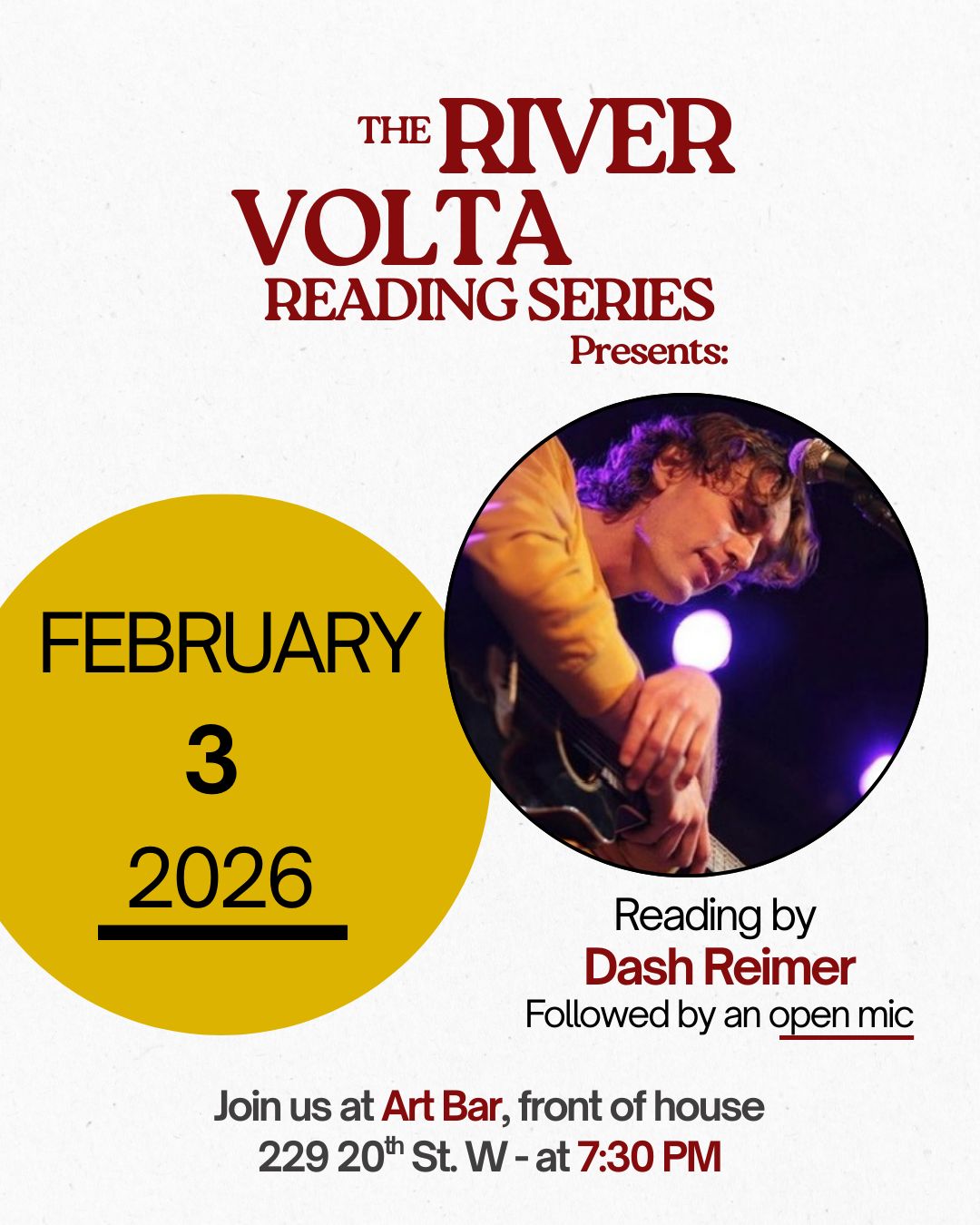 Join us on Tuesday, February 3, 2026 for our River Volta Reading Series with Dash Reimer, followed by an Open Mic!