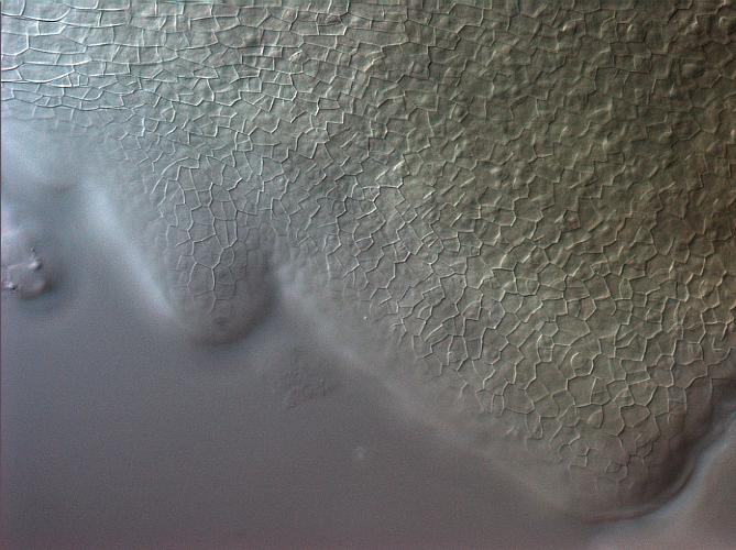 Arabidopsis Leaf seen on a Zeiss stereoscopeNote the bulgy epidermal cells, which are characteristic of mutants with microtubule defects. In this case, the line is the botero-1 mutant, which lacks microtubule severing activity, and has abnormal microtubule organization.