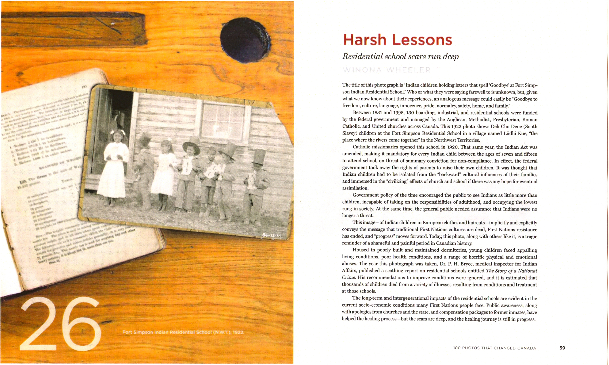 “Harsh Lessons, Residential school scars run deep.” P. 5 in Mark Reid ed.. National History Society, 100 Photos that Changed Canada. HarperCollins Canada, 2009.